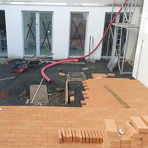 V prostoru jídelny a ateliéru jsou osazeny zařizovací předměty, dokončuje se montáž vzduchotechniky, osazování topných těles, finální úprava stěn a podlah. Probíhá montáž konstrukce pro jídelní lavice. Ve dvorním perimetru pokračují práce na povrchu pobytového schodiště z lícových cihel.